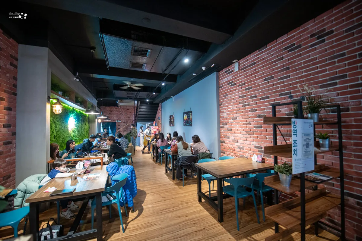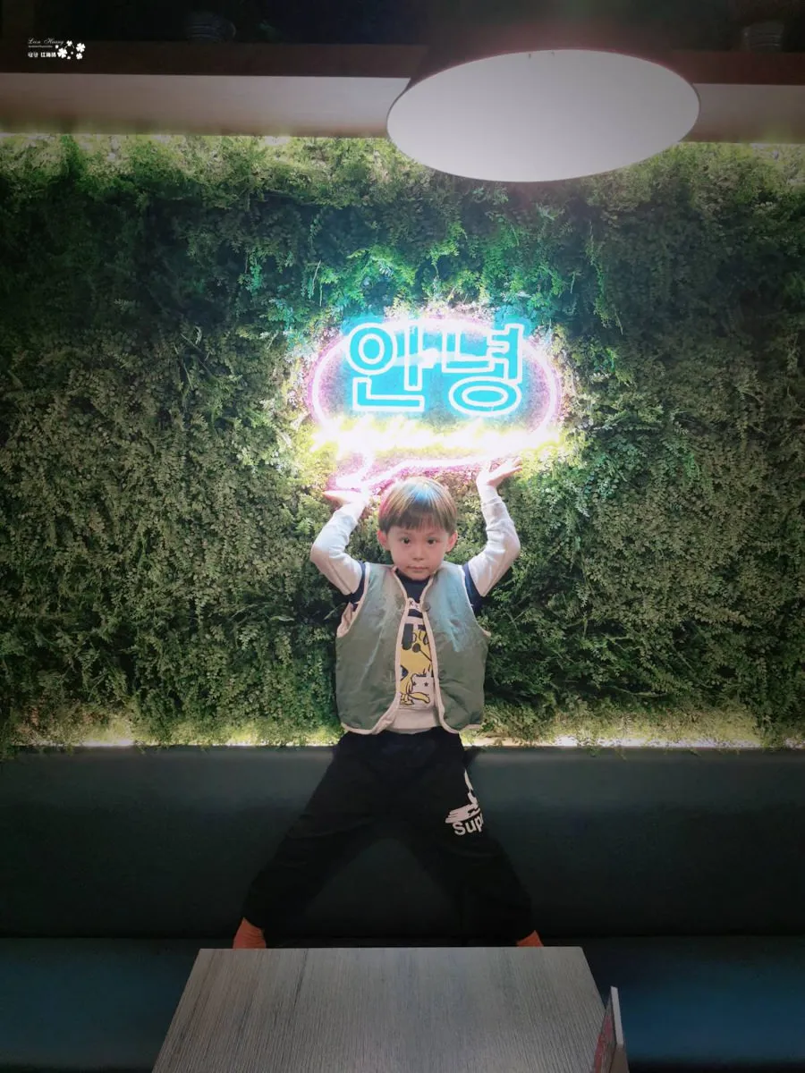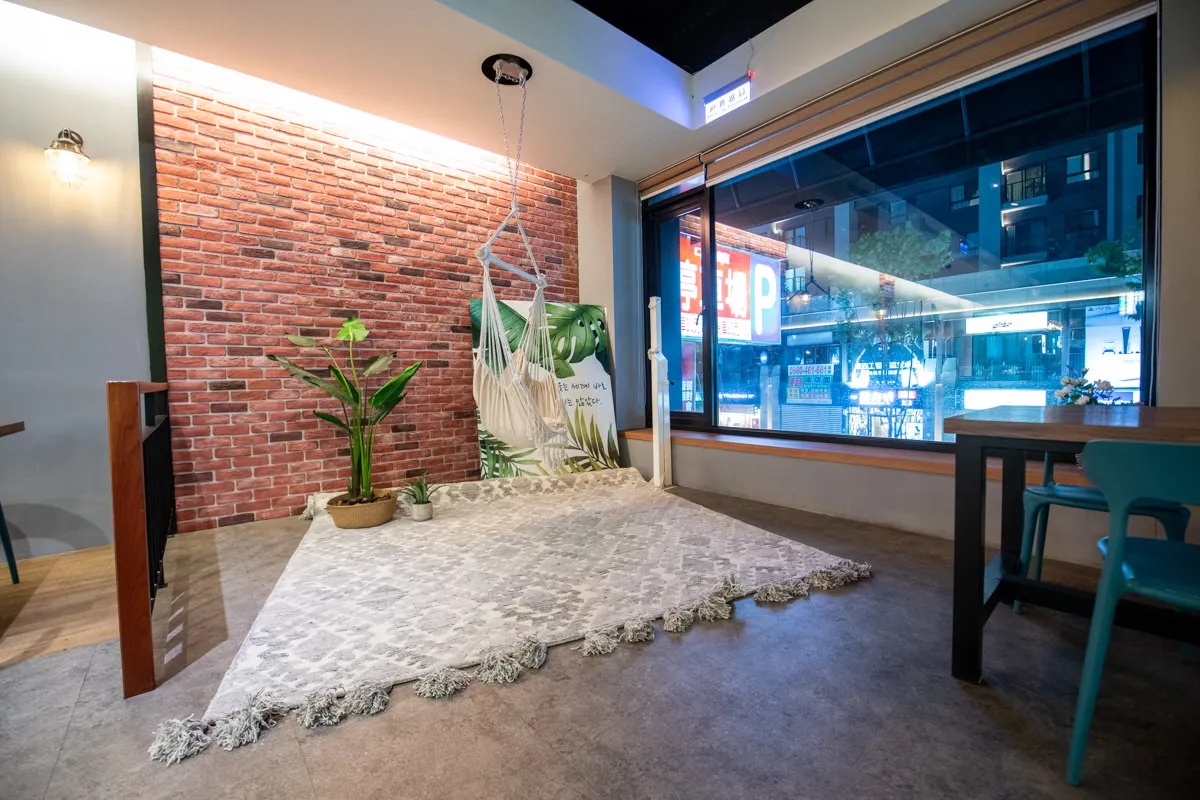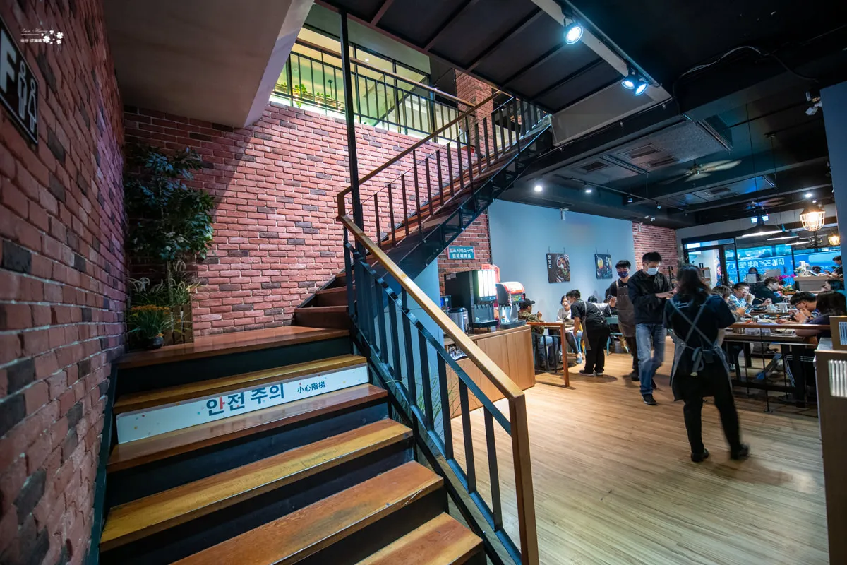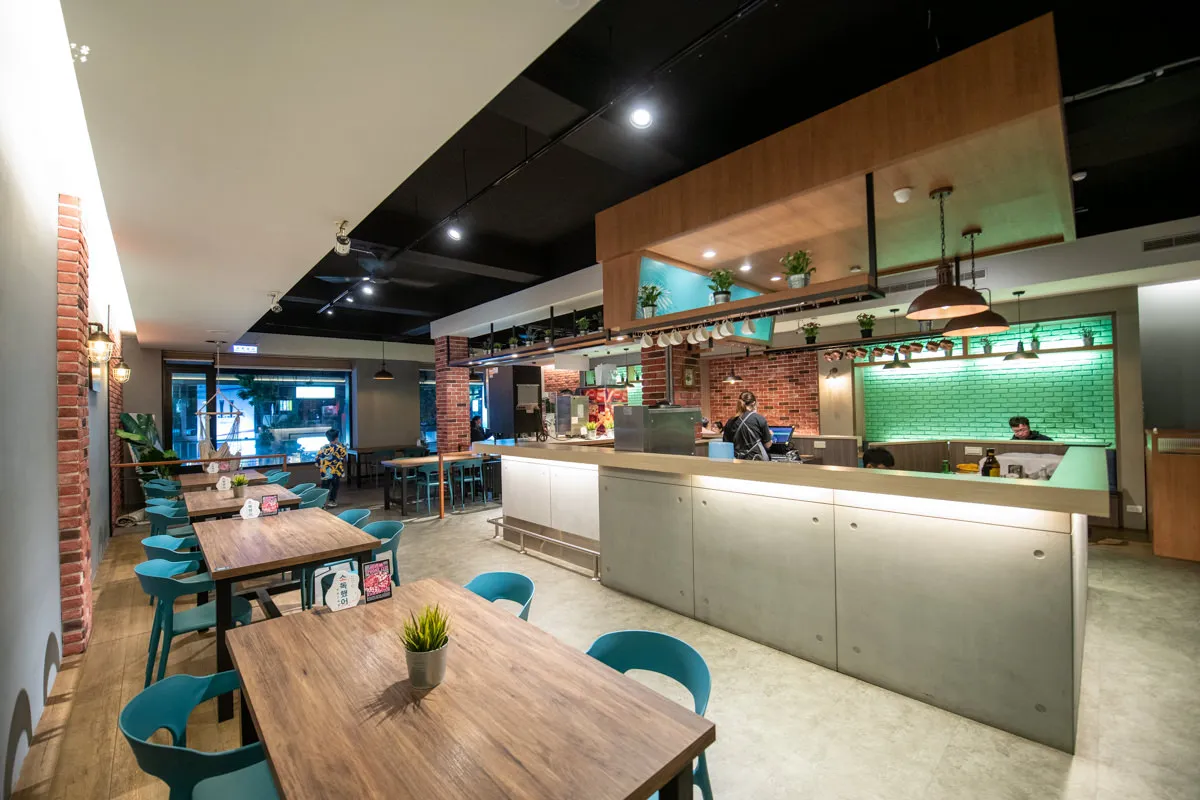 內斂且直率的輕工業風是樂多多集團喜愛的裝潢風格,各間店都以此為主軸玩轉出各自的特色。辛韓道-桃園中華店的用餐空間分為一樓與二樓,一樓兩側以懷舊的磚色文化石,打造溫暖的色調主軸,一側以斑駁灰的系統板材,過度了色彩,在透過彩色畫作點綴視覺亮點。另一側更是以大面積的綠意搭配懷舊絢麗的霓虹燈裝飾,打造出獨特的都會光感,也成為一樓一處打卡拍照的人潮聚集點。