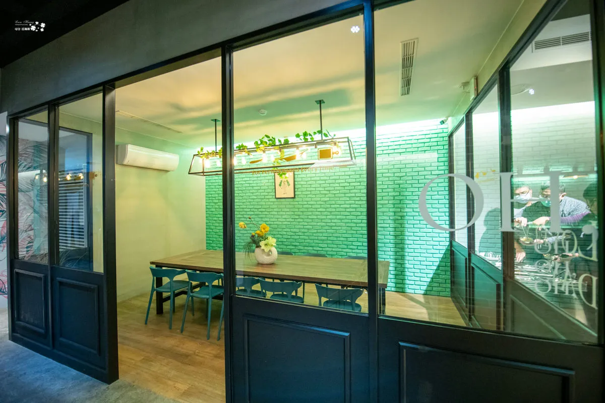 一走上來左側是一間絕美包廂,一整面的Tiffany綠磚牆、牆面與天花板,混搭玻璃拉門,透過植栽與木質的運用,包裝出精緻質感的休閒氛圍,女王看了好喜歡說,直說下次要預約這個位置。經過詢問目前使用這個包廂似乎沒有低消限制,看起來有10個位置,下次找家族一起來用餐唄。