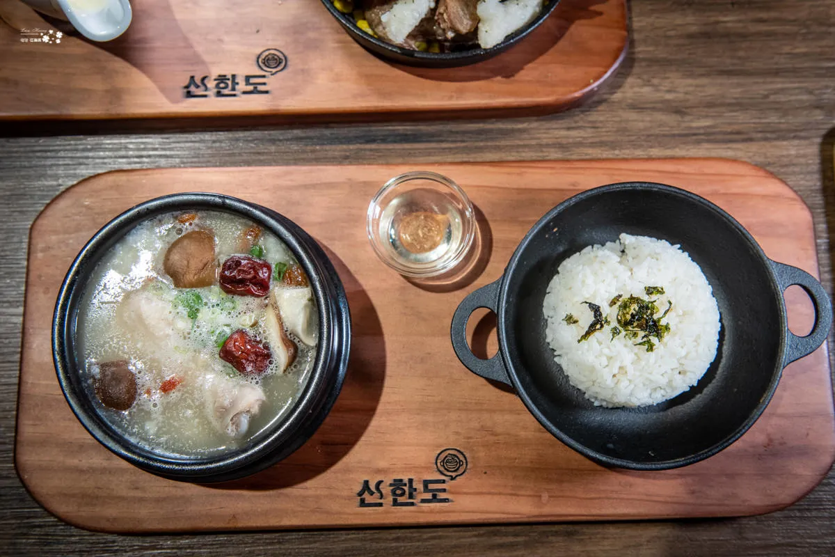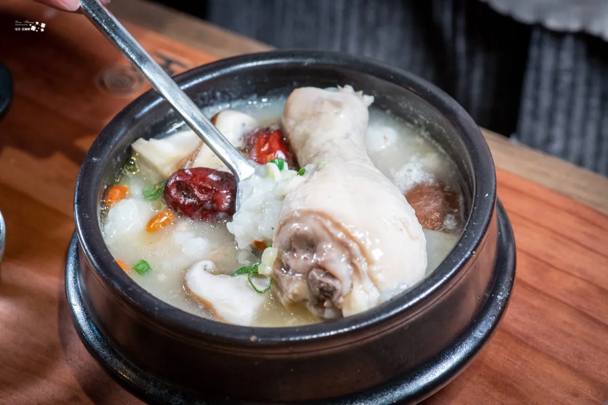 一上桌清淡的人蔘香氣撲鼻,那香氣充盈持久,每次來韓式料理餐廳,人蔘雞湯幾乎是女王必點選項。人蔘雞湯內內有紅棗、枸杞、糯米以及一隻雞腿,中間的是人蔘酒,依照個人喜好添加,還附上一碗白飯。柔嫩的雞肉帶著人蔘清香,吸附人蔘精華的白粥,軟濡的譜出人蔘雞肉交響曲,在嘴裡昇華成沁爽美味。