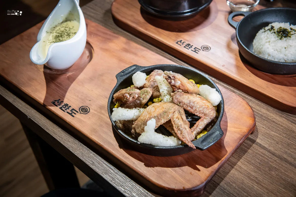 辛韓道的餐點以鍋物為主,每一種鍋物都會附上一碗白飯,針對2人或4人分別推出$1080與$2288的組合套餐,另一面菜單則是單點的部分,有沙拉、開胃菜、炸物、烤物、主廚創意料理與調酒。主廚創意料理是店內主廚加入個人巧思的韓式料理,如「牛肉酥」與「春川剝皮辣炒雞」等,跟一般坊間常見的韓式料理有所不同,特別的口感與美味值得一試。調酒皆以韓式燒酒為基底,再搭配其他酒品調配出極具視覺效果的微醺感受。