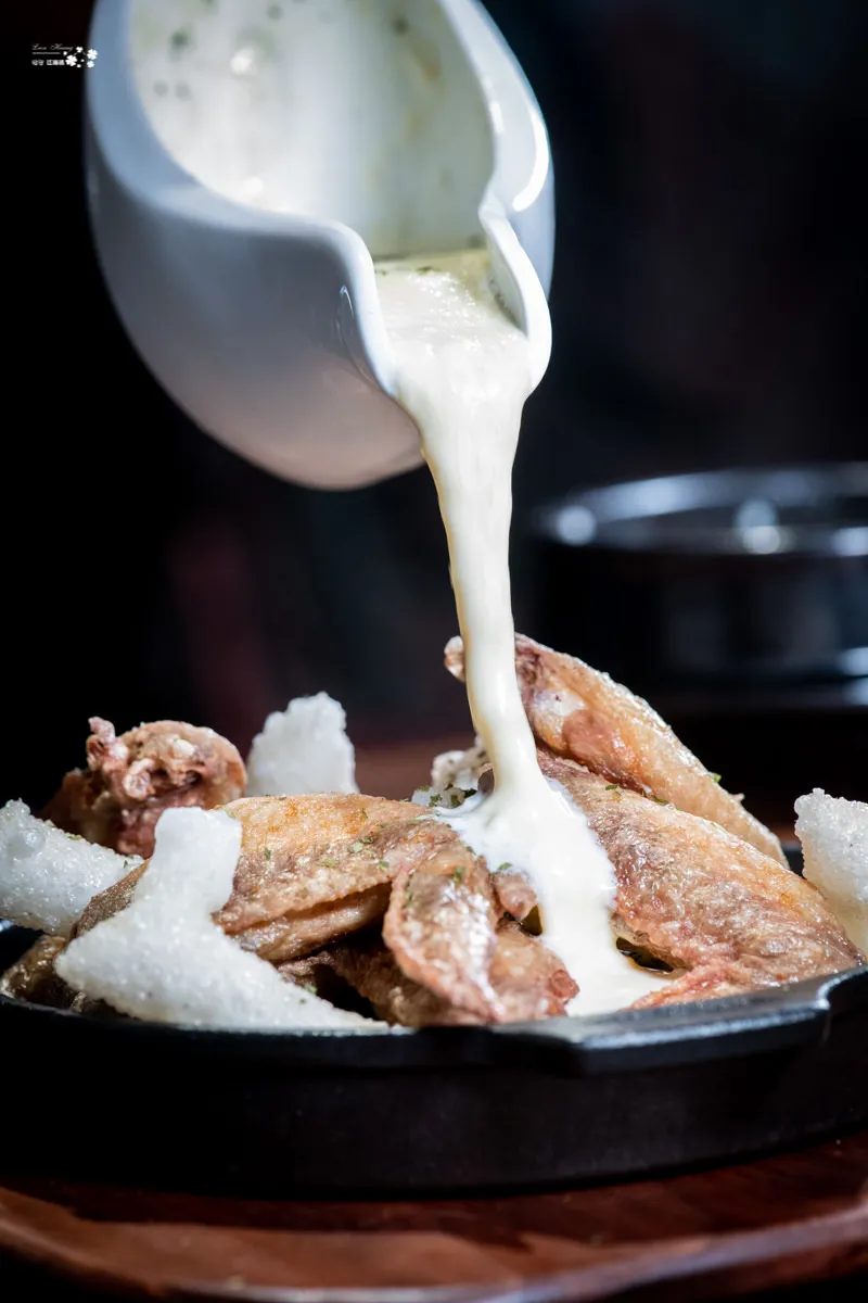 白色的是炸年糕,脆脆的表皮略微黏牙。原味雞翅保有雞肉的原汁原味,肉嫩多汁。淋上香濃的起司醬後,讓味道、口感和顏色上都加分,起司芳香傪著玉米香氣,那明顯的甜味也帶起鮮嫩飽滿的雞翅口感,滑嫩但不膩口的滋味,好吃唰嘴。