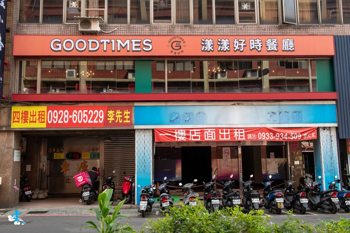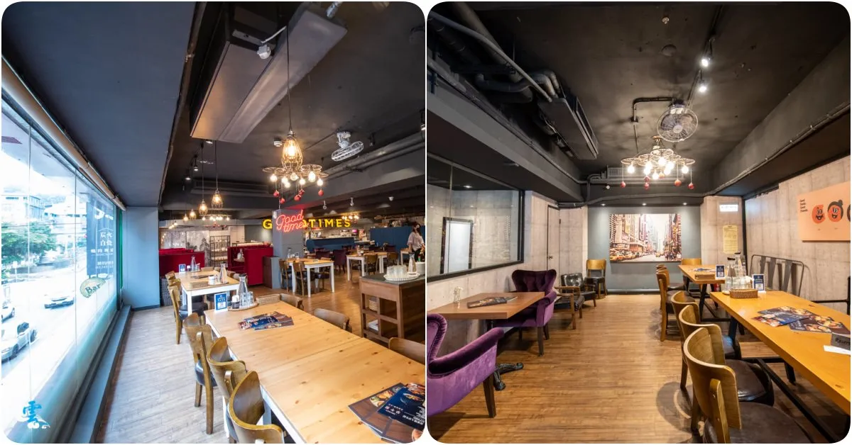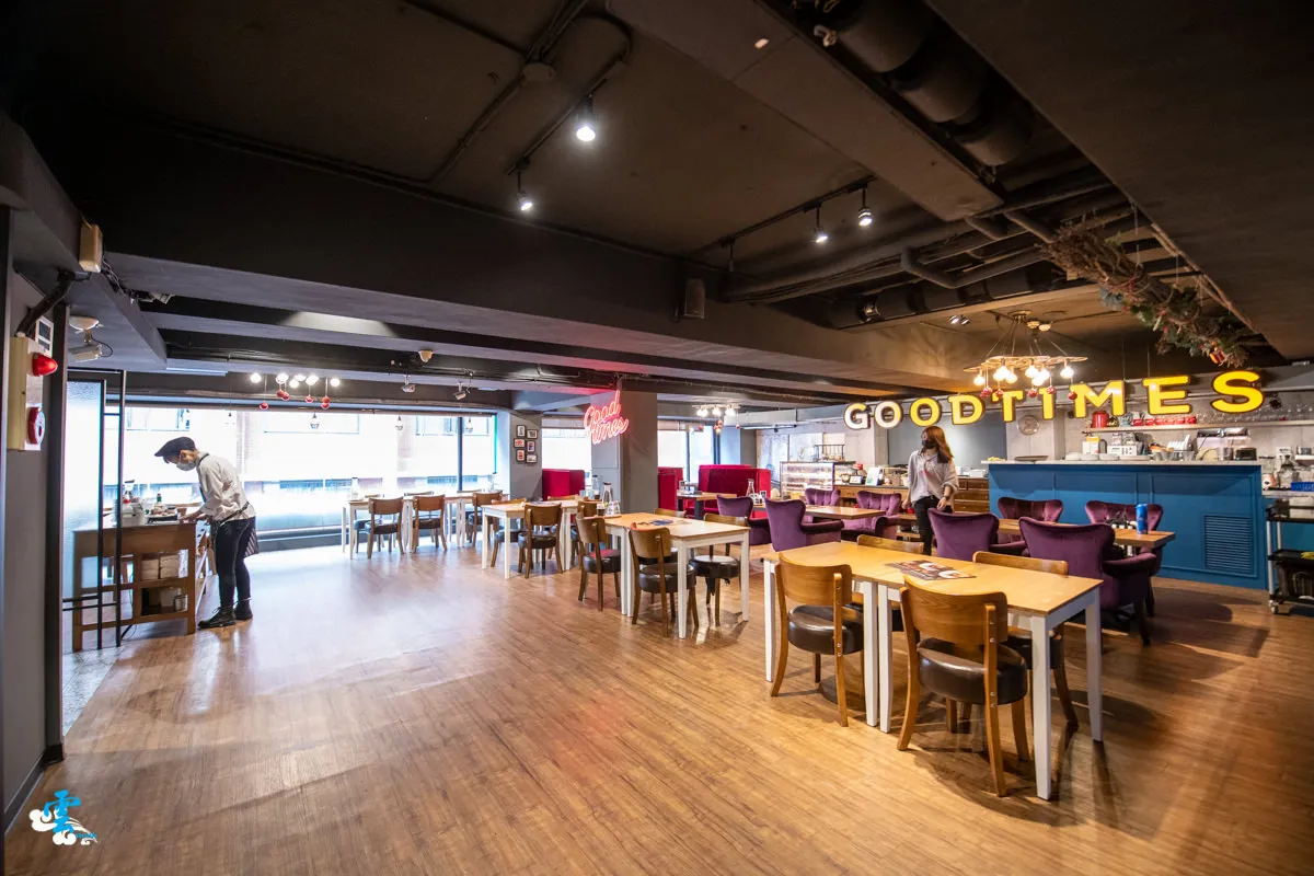 結合工業風而成的現代混搭風,是漾漾好食餐廳的裝潢主軸,有別於一般工業風採用的混泥土磚牆,漾漾好食採用質感更優的清水模磚牆,呈現更純粹的建築美感,黑色的天花板毫不掩飾地外露管線支架,再以對比色的牆面去拼接,藉此改變視覺上的比例,展現另類的時尚和現代感受。大面積的落地窗,帶來明亮的光線與視覺延伸感,透過高明度的色彩去點綴沙發、櫃台與GOODTIMES字眼,營造視覺亮點,最後透過暖色系燈光、溫潤的木質桌椅與地板,為用餐空間注入那份溫暖感受。
