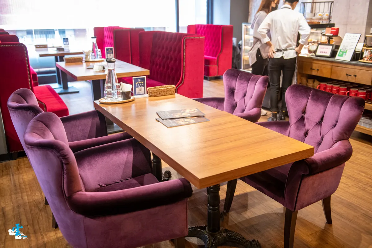 一走進來,靠窗的鮮紅色沙發座位,基本上會是你第一個想選擇的座位,很可惜雖然凌雲是第一個來訪的顧客,但紅色沙發區早已被訂位一空了。還好還有優雅的紫色沙發區可選,如果喜歡靠窗的位置,長條形的木質桌椅也是不錯的選擇。
