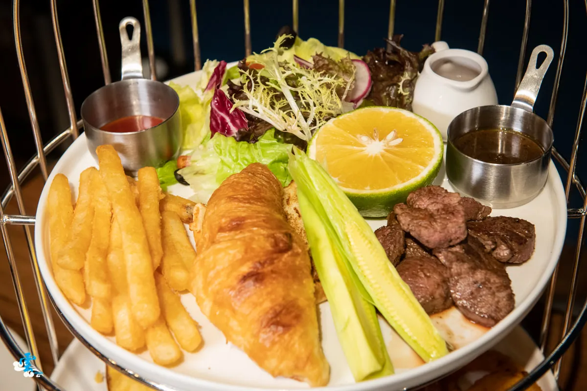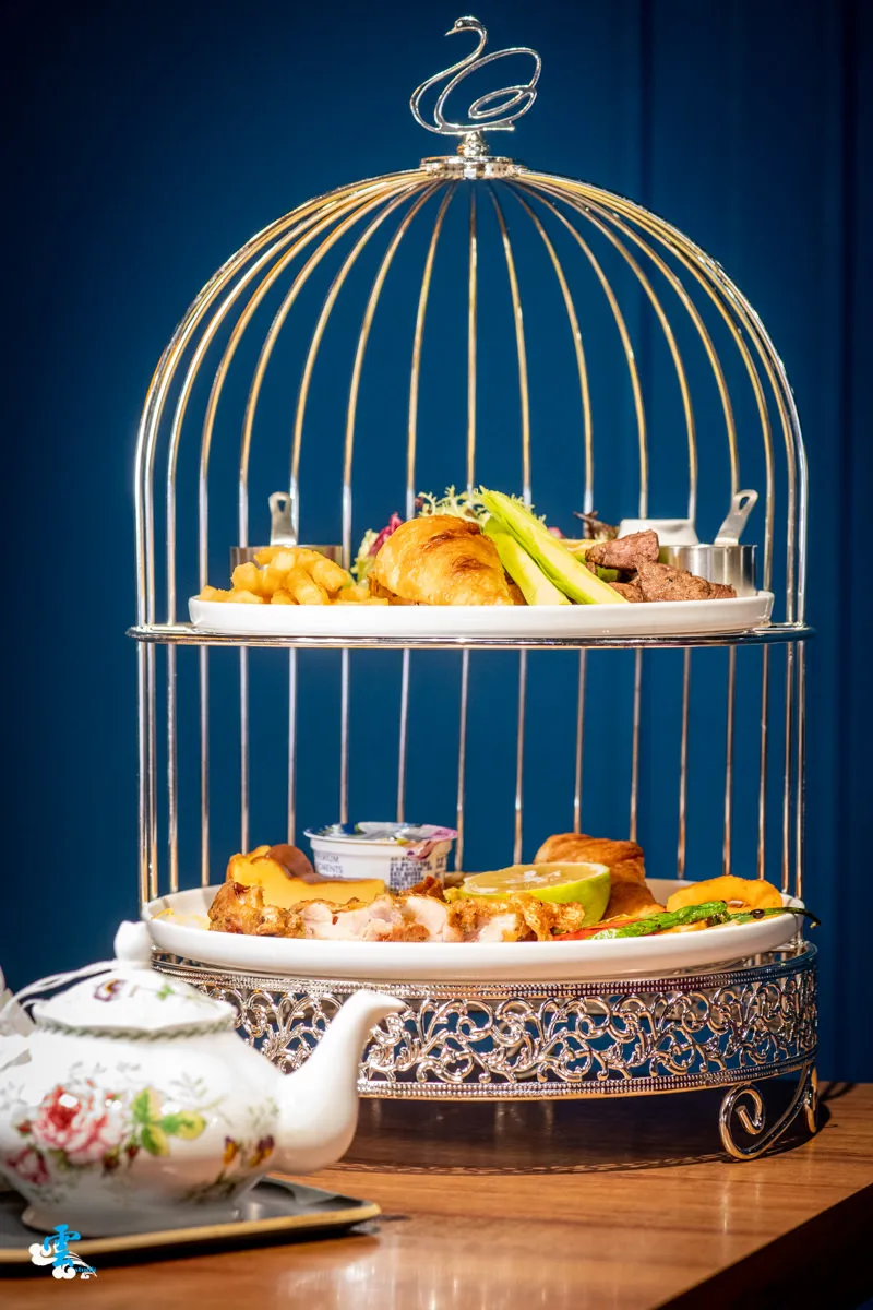 圖|金絲的雙層鳥籠點心盤配上豐富的餐點,美味又高貴。