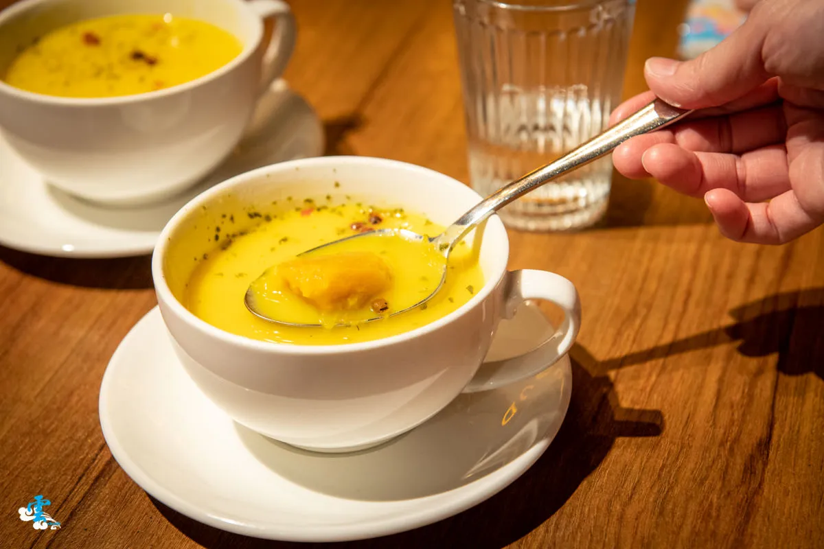 可以選擇鮮奶茶或是主廚濃湯,凌雲選擇的是主廚濃湯。今日的主廚暖湯是南瓜玉米湯,玉米粒的脆度與南瓜末的軟濡,豐富了口感的層次,香濃滑順的南瓜香氣起了畫龍點睛之妙,綿密的甜香暖心又暖胃。