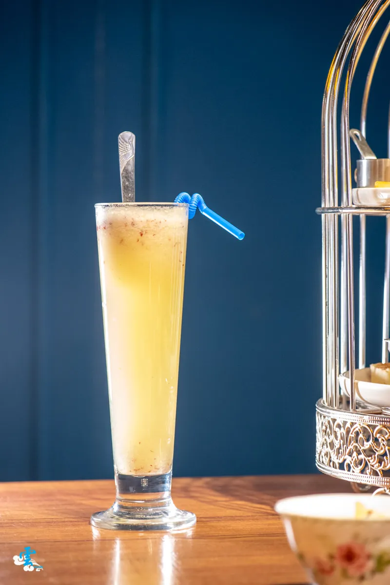 共有六種選擇,包含鮮打蘋果鳳梨汁、經典熱可可、夏日水果茶、皇家伯爵鮮奶茶、太妃糖鮮奶茶與經點拿鐵等六種常見的午茶組合。凌雲與女王分別選擇了太妃糖鮮奶茶與鮮打蘋果鳳梨汁。