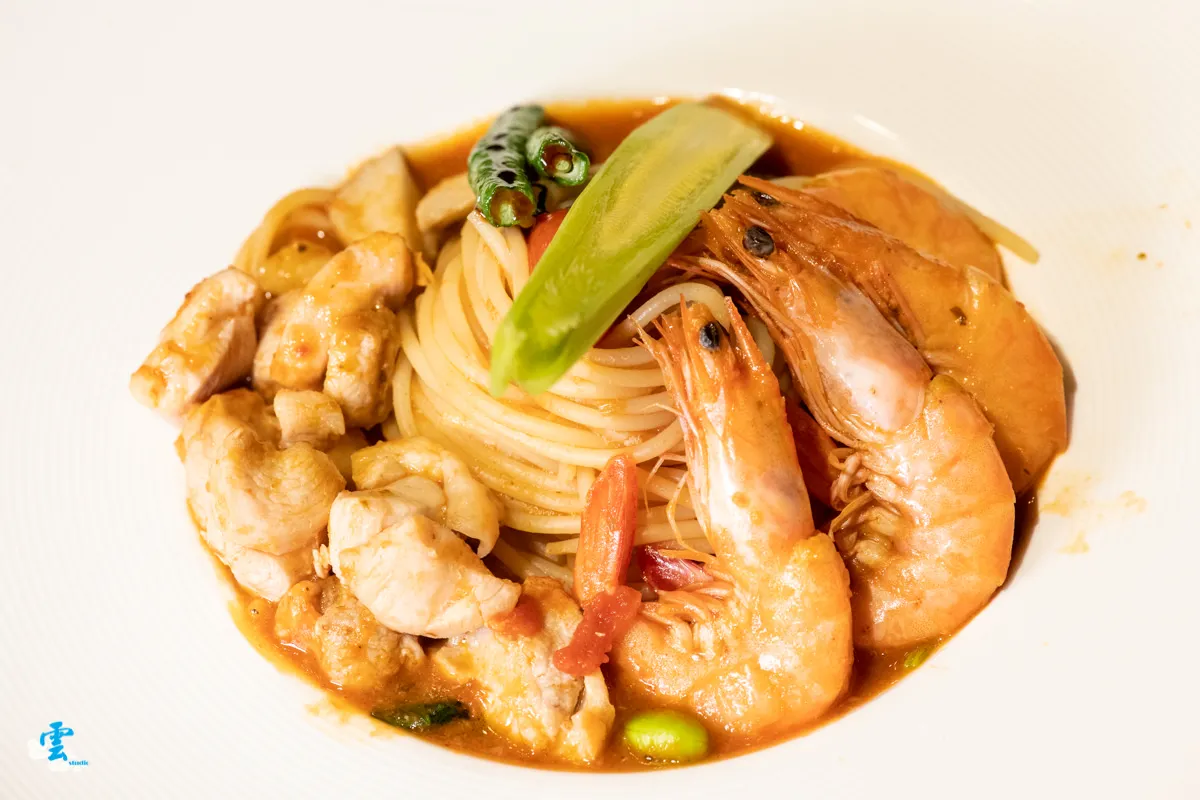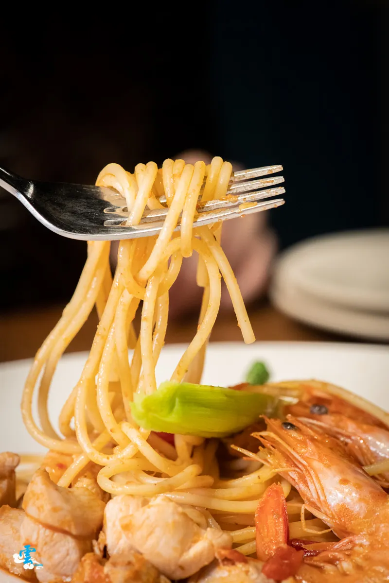 彈牙的麵條盡是飽滿入味的番茄醬香,牛番茄醬的香氣隨著咀嚼越發濃郁,奔放的勾勒出鮮蝦的鮮味,也讓柔嫩多汁的雞肉滋味更加立體,豐富層次在嘴裡譜出一曲節奏鮮明的美味。