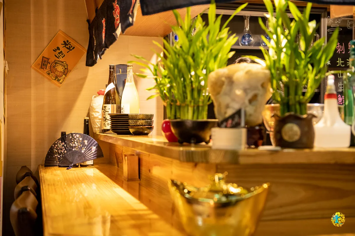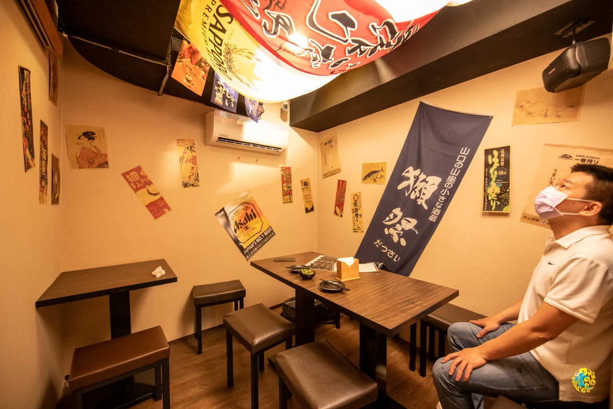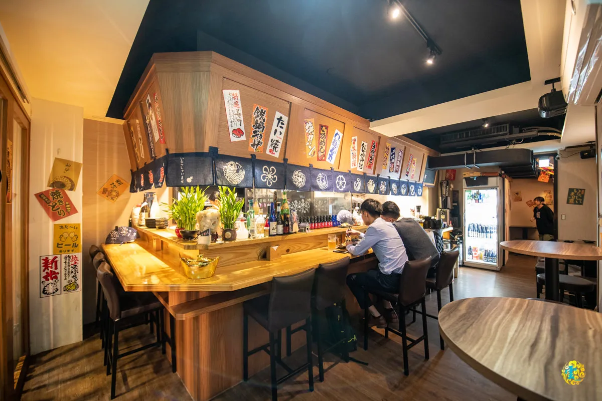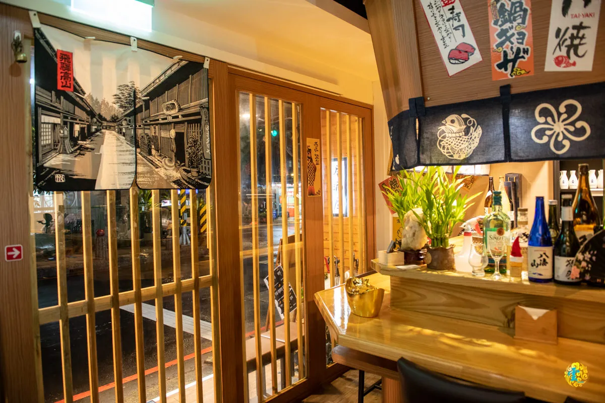 一推開大門,左邊是日式居酒屋常見的長條形吧台設計,使用眾多日式元素點綴,黑色系的天花板增加了視覺層次感, 透過溫潤的木紋桌椅與暖色系燈光,讓空間兼容溫和與個性的多元樣貌,合適的空間距離,讓每桌顧客都能保有獨自的呢喃自在。最裡面有個半開放式的包廂,適合想要保有一點隱私的朋友。