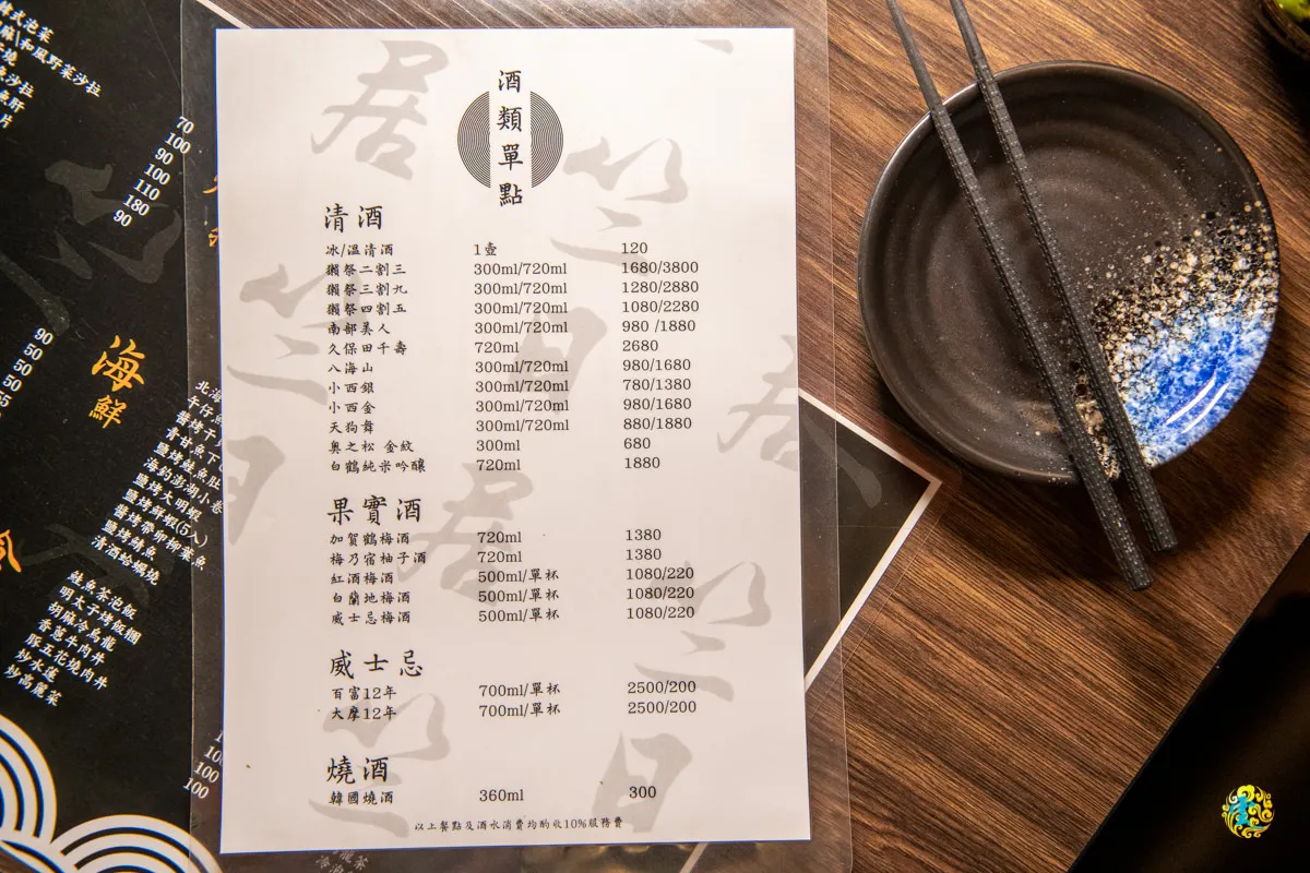 哲日居菜單很簡單的一式兩份,餐點類以黑底白字增加閱讀性,依據菜色種類去區分,價格也清楚標示,清酒、威士忌等則以白底黑色來與餐點類菜單做區隔,分類清楚明確。