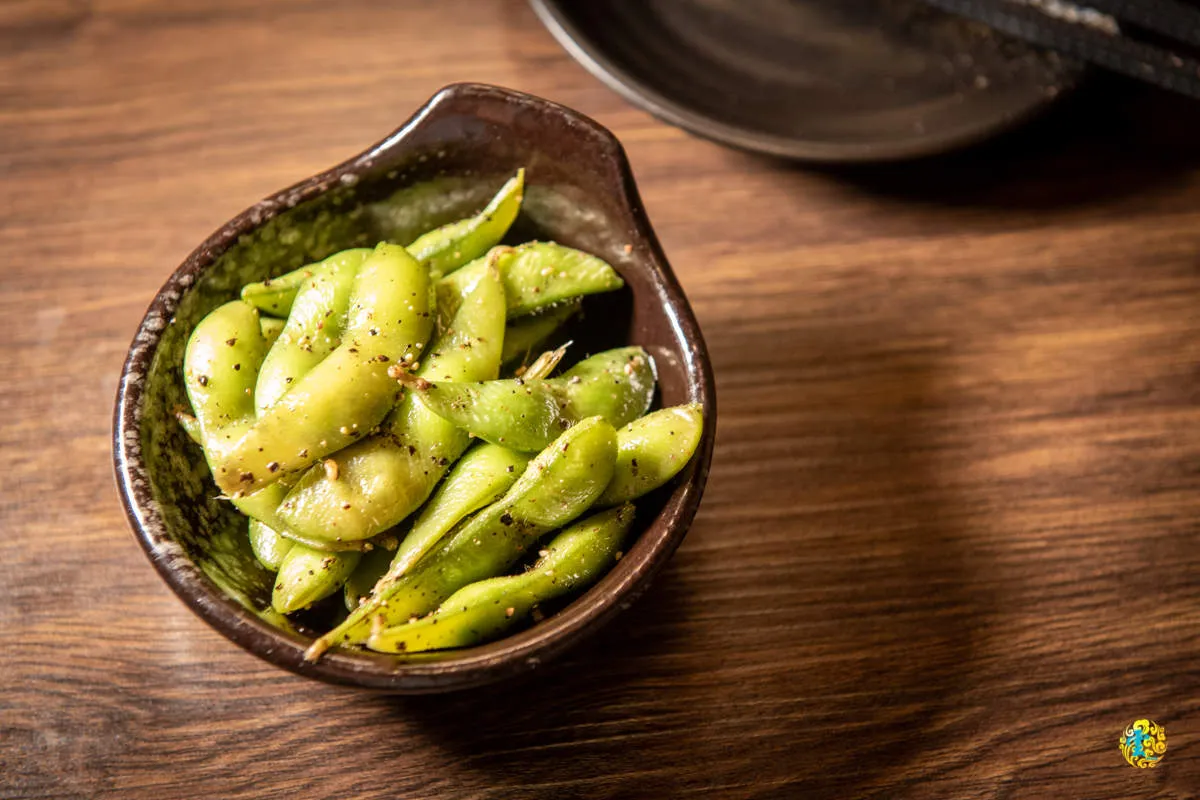 這是在居酒屋招待的小菜,鮮綠的水煮毛豆搭配粗黑楜椒粒,清脆爽口又開胃。