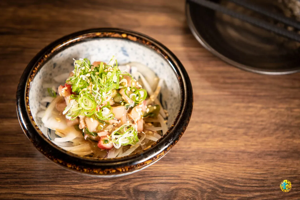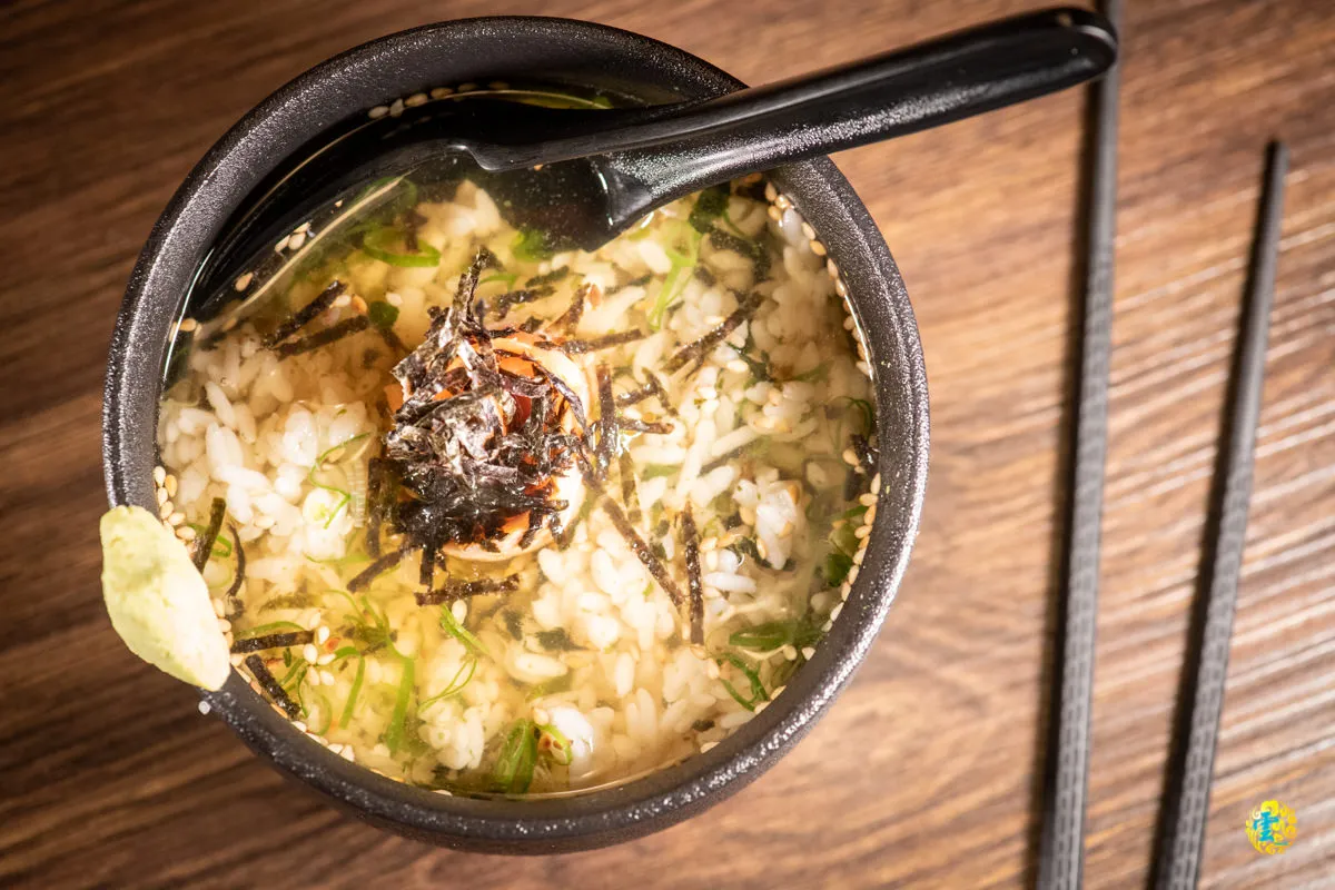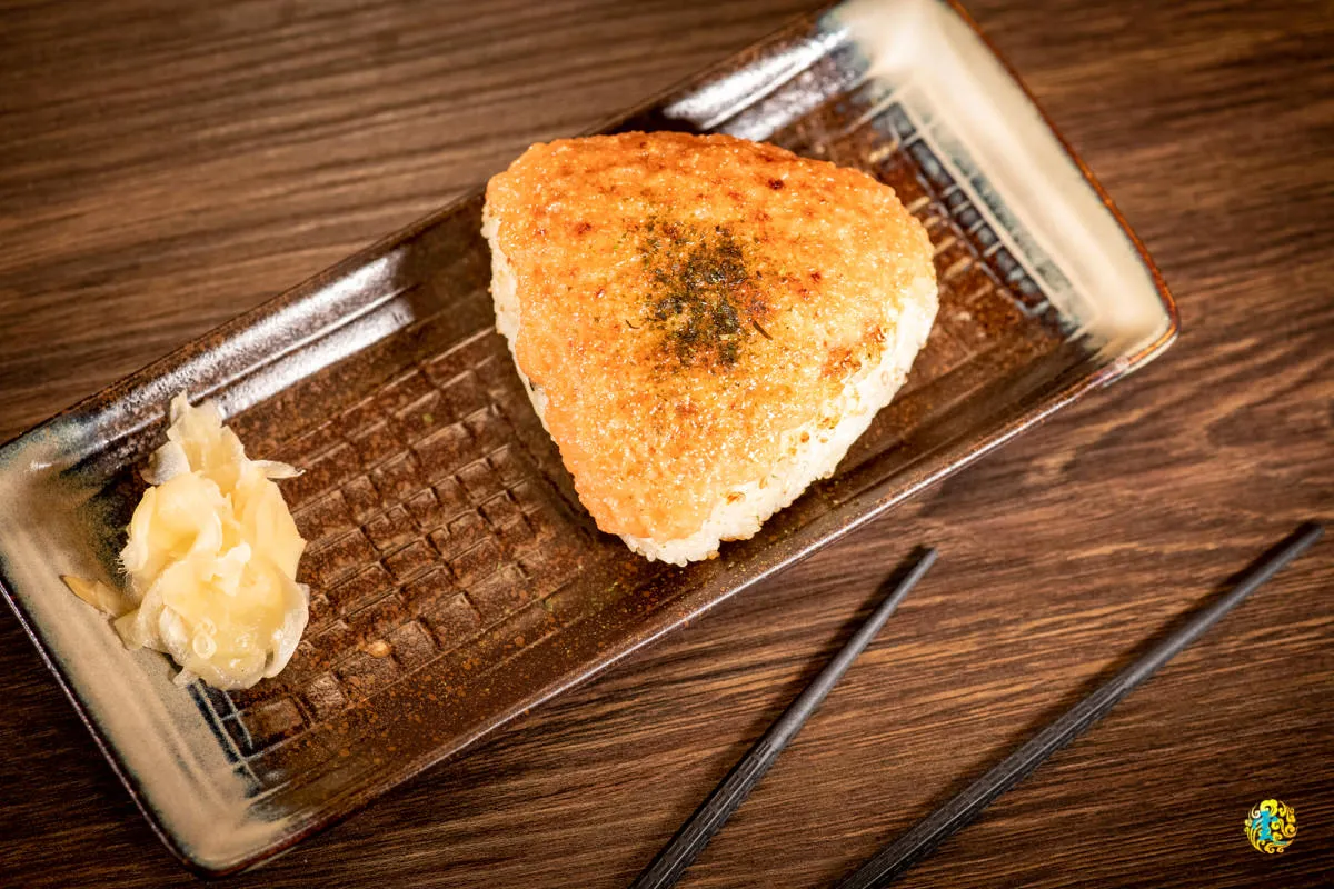 鮭魚茶泡飯跟飯團都是在居酒屋中填飽肚子的熱門選項,將煎過的鮭魚捲成柱狀放到泡飯中,在撒些蔥花與海苔,一旁有哇沙米提供調味,鮭魚保有柔軟的口感,海苔略微搶味成了明顯的味覺主軸,通常茶泡飯都是最後收尾的菜色,所以味道上會略微清淡,茶湯溫潤解膩又順口,雖然樸實無華卻是關鍵的美味料理。