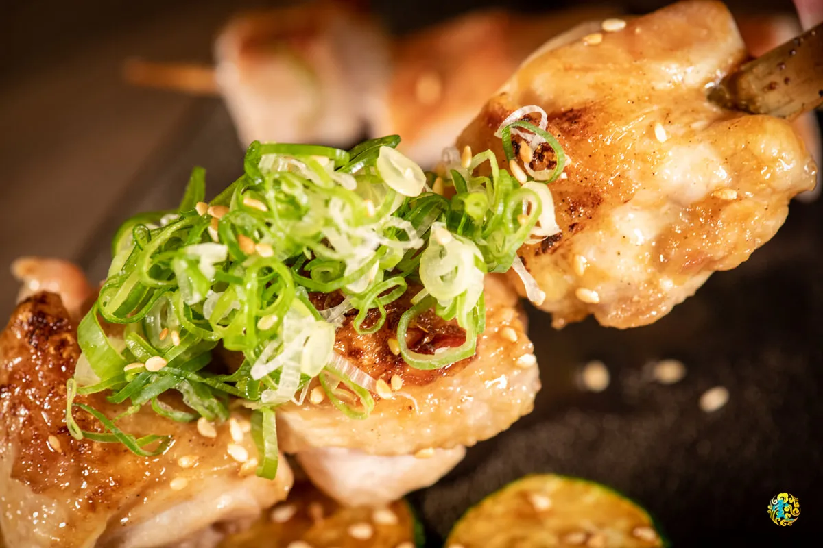 醬烤雞腿串,上頭的蔥好香,對滋味的加分超大,火侯掌控的很好,滴點金桔創造美妙的味覺轉化,滋味清爽不油膩,每一口都是舌尖上的美味風景。
