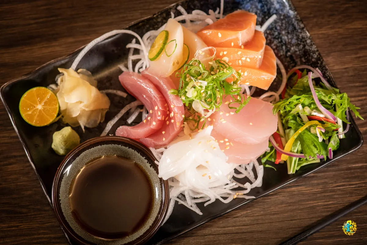菜單上沒看到綜合刺身,這是小黑版上的當日料理,內容頗豐富,有鮪魚、鮭魚、花枝、干貝與旗魚等。鮪魚擁有濃厚的甘甜風味,軟中帶綿的滋味,一放入口中就能感受到入口即化的口感。鮭魚生魚片切的頗厚,鮮美甘甜的滋味在口中迴盪。肉質肥厚飽滿的花枝,被切成細長片狀,表皮爽脆的口感,十分迷人。每顆干貝上都有配有一片金桔切片,一起食用能帶出更多干貝的甘甜韻味。細緻又帶著嚼勁的旗魚生魚片,滋味清甜爽韌。